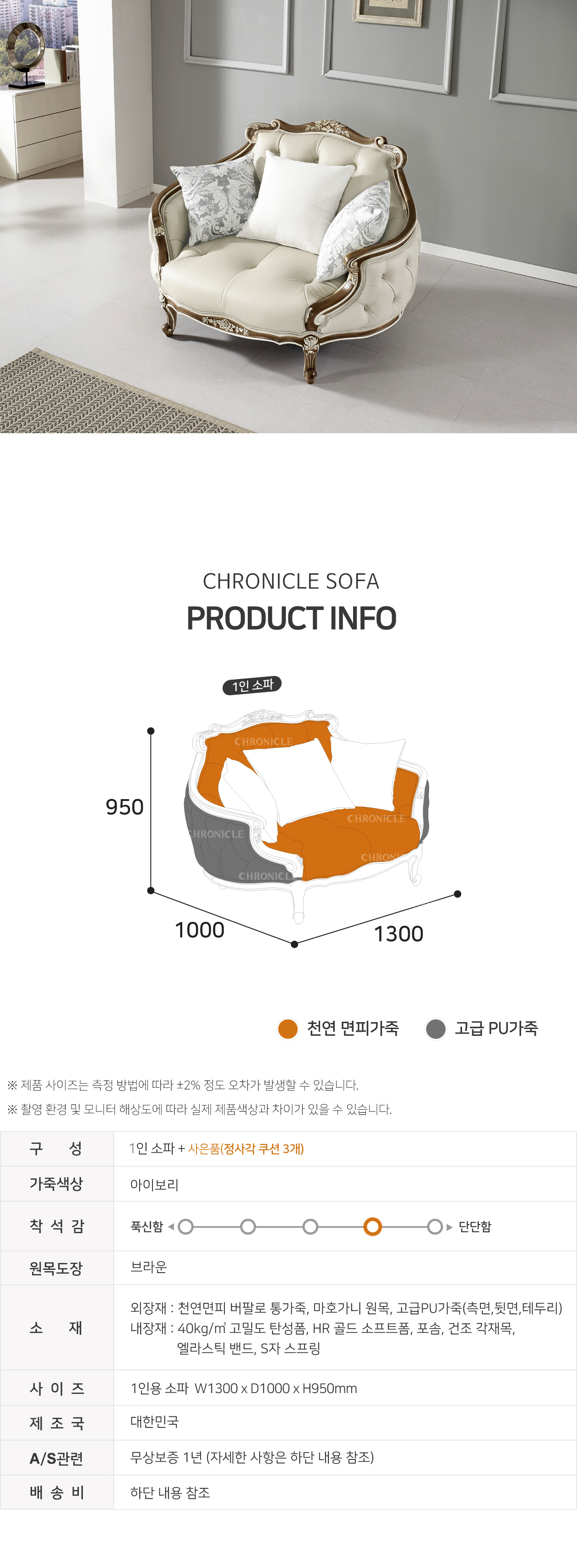[직영생산 주문제작] 면피가죽 단추2단 1인용 쇼파 SFC-7706
